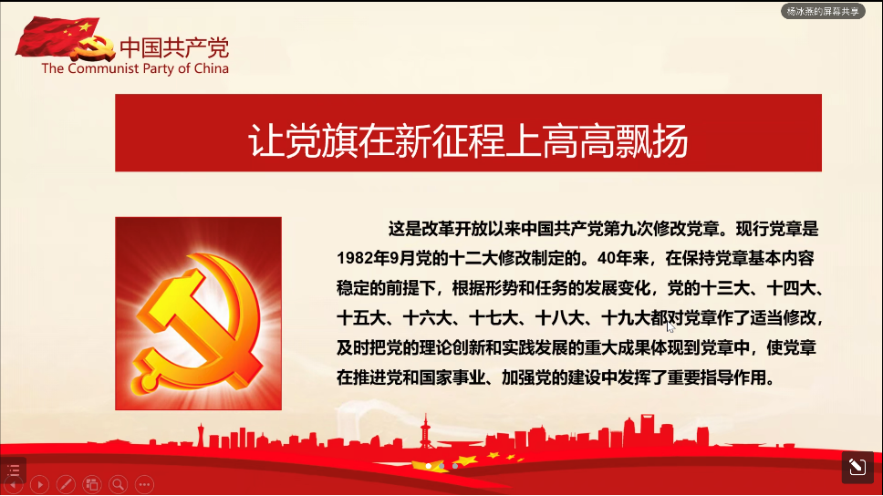 随后戴梦娟同志带领大家回顾了我国近十年的教育情况并指出教育发展特点,而后分析了二十大报告中的教育总体思路,并且强调了办好教育的五大重点任务。最后由杨冰燕同志围绕《中国共产党章程(修正案)》进行领学,她从党章的修改历程、修改的必要性出发,带领大家着重学习了党章中的修改、新增部分内容。