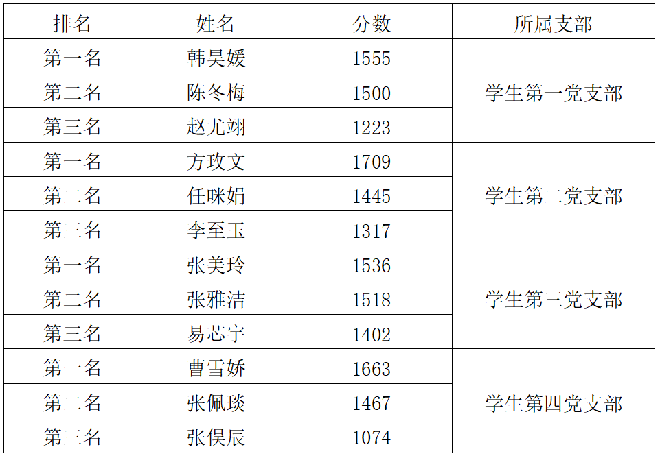为切实用好“学习强国”平台,持续推动“学习型”基层党组织建设,现对英语师范学院各学生支部2023年3月“学习强国”积分前三名的同志进行公布,具体名单如下: