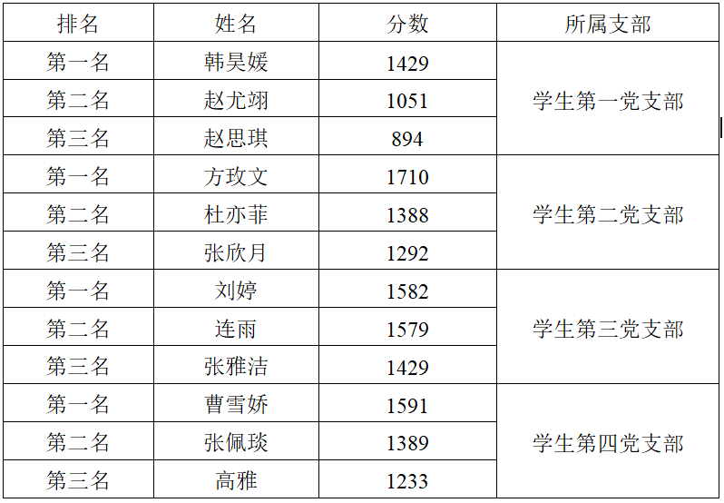 为切实用好“学习强国”平台,持续推动“学习型”基层党组织建设,现对英语师范学院各学生支部2023年4月“学习强国”积分前三名的同志进行公布,具体名单如下: