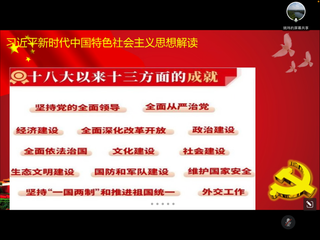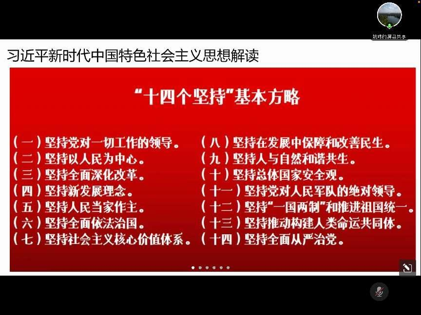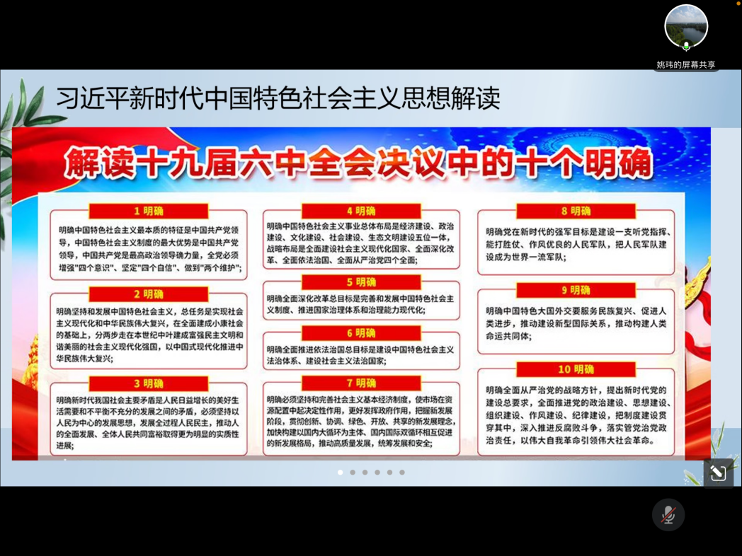 随后,姚玮带领大家学习了党的十九大、党的十九届六中全会指出的“十个明确”、“十四个坚持”、“十三个方面的成就”,使大家进一步明确习近平新时代中国特色社会主义思想主要内容构成。