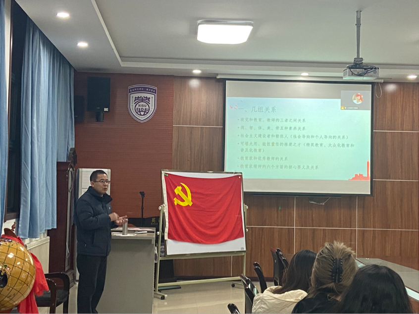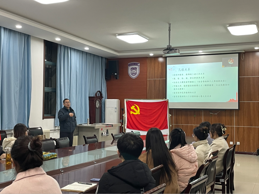 本次党课的主题为 “习近平总书记给全国优秀教师代表的信——从教育学的视角解读几组关系”。首先,冯东对党政、教育、教师三者之间的关系、德智体美劳五种素养关系、社会主义建设者和接班人(社会导向和个人导向的关系)、可堪大用、能担重任的栋梁之才(精英教育、大众化教育和普及化教育的关系)、教育家和优秀教师的关系、教育家精神的六个方面的核心要义及关系等进行了深入浅出的说明。