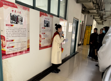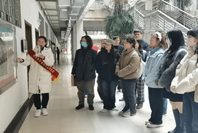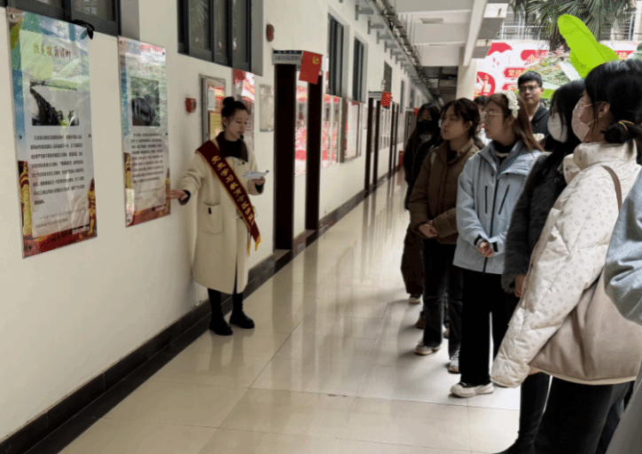 随后,讲解队成员任若语同学为来访者进行了西区“延安十三年”专题板块的集中介绍。西区由中国语言文学学院党委和英语师范学院党委联合承建,围绕“党在延安的十三年”,通过详实的历史资料,艺术作品展现和主题雕刻板画等形式,回顾了党在延安十三年的革命历程。