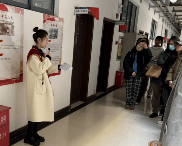 首先,任若语同学从体现了延安风土人情的雕刻剪纸版画开始了西区的介绍。随后她又向同学们介绍了延安精神的内容及内涵,以及习总书记对于延安精神的深入解读,鞭策全体党员认真践行延安精神。接下来,她总结了延安十三年的三个历史阶段,并带领大家浏览了在此期间的一些重大战役和重要会议,同时结合时代背景和历史事实又向同学们介绍了分立于南北两侧的四幅油画。在中央楼梯下的红旗造型处,任若语同学与来访同学们进行了友好互动,共同复习了《七律▪长征》诗词内容,并向大家介绍了毛泽东主席与八角帽的故事,激发了参观者的参观热情,同时也介绍了这座红旗/红船造型的独具匠心的设计灵感。随后她又带领着参观同学们,深入了解毛泽东《论持久战》著作诞生的背景及其意义,以及埃德加▪斯诺《红星照耀中国》的历史背景。在西区讲解结束的尾声,任若语用扎实的中英文语言向同学们总结了党在延安十三年的辉煌功绩。