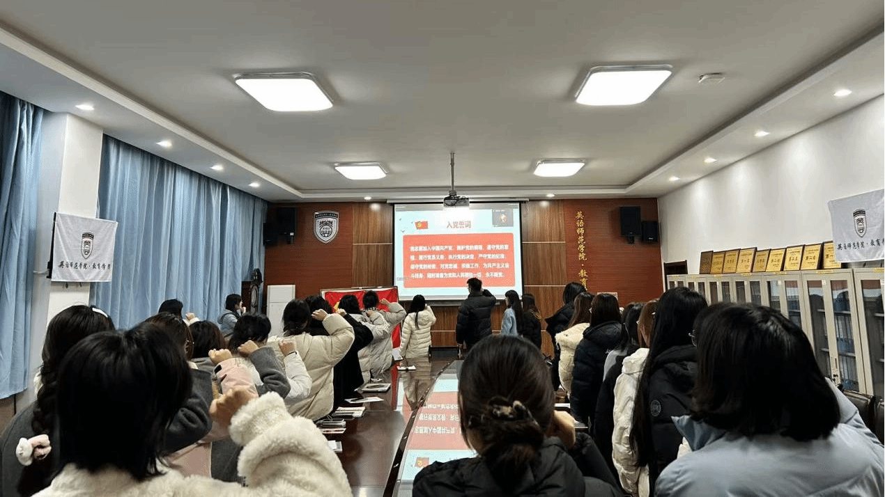 会议第二项,召开预备党员接收大会。首先,四名发展对象(俞金慧、杜斯鹏、吴杨泽、杨梅)依次向党组织汇报了自身情况,包括对党的认识、入党动机、个人履历、家庭和主要社会关系等。随后,四名同志的入党介绍人对发展对象的基本情况进行详细介绍,就其存在的不足之处发表意见,并对其未来发展方向提出了建议。支部组织委员张曙晨和支部宣传委员陈紫涵代表支委报告对发展对象的审查情况。与会党员充分讨论后,采取无记名投票方式进行表决。大会一致同意接收俞金慧、杜斯鹏、吴杨泽、杨梅同志成为中共预备党员