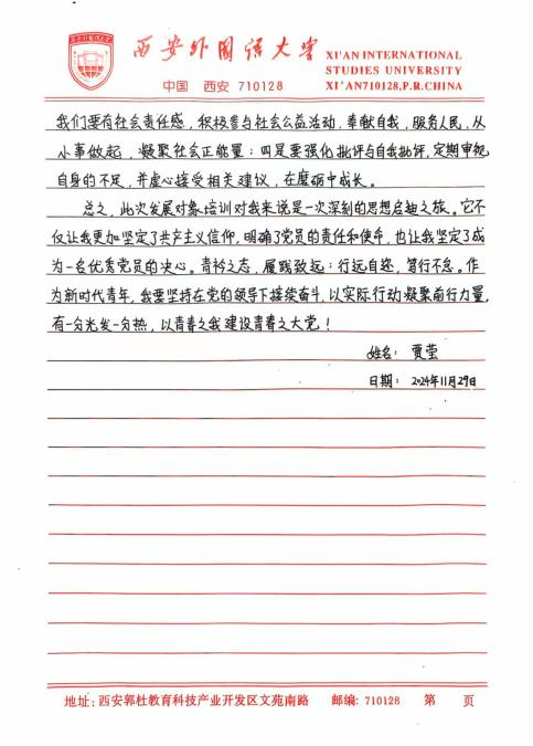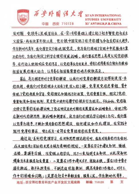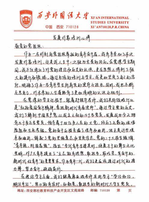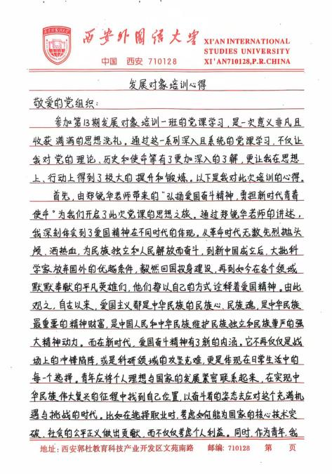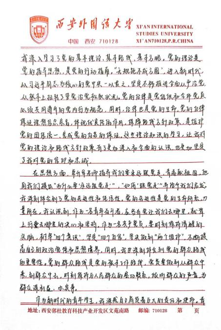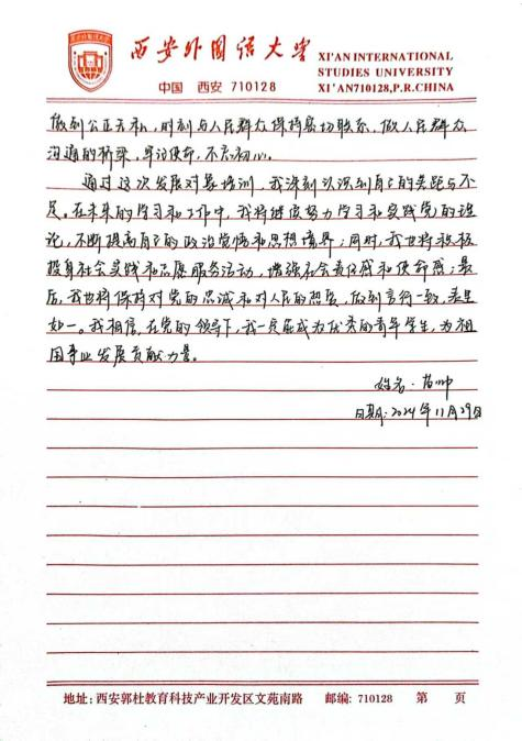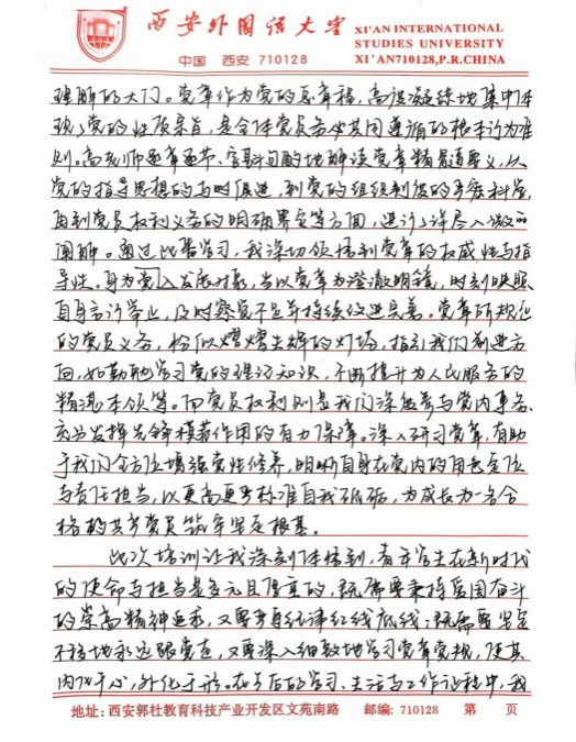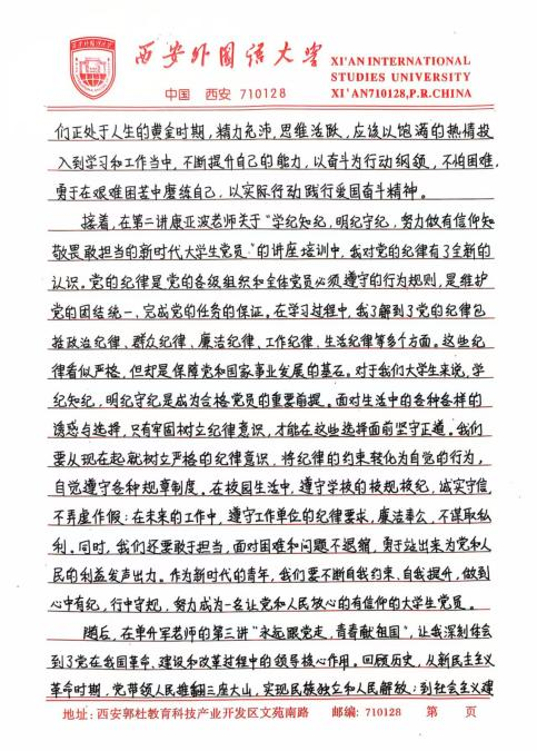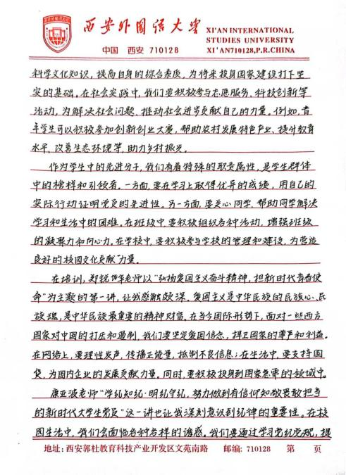 此次培训让我深刻体悟到,青年学生在新时代的使命与担当是复多元且厚重的,既需要秉持爱国奋斗的崇高精神追求,又要严与律红线底线;既需要坚定不移地永远跟党走,又要深入细致地学习党章党规,便其内化于心,外化于行。在今后的学习、生活与工作让中,我将以更为严格的标准自我鞭策,笃学专业知识,全方位提升综合素质,踊跃投身社会实践与志愿服务活动,在磨砺中锻造坚毅不拔的意志品质。时刻铭记党的谆谆教诲,以党员标准严格律已,矢志不渝地朝着成为一名光荣的中国共产党员目标西进,在党旗飘洋引领下践行青年便命担当,为中华民族伟大复兴宏伟燕图的绘就倾尽全力。我坚信,只要广大青年学生凝心聚力,在中国共产党的坚强领航下,它能铸就更加了绚烂辉煌的未来,书写无愧雨时代的壮丽华章。