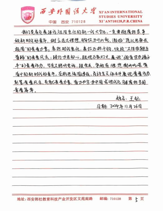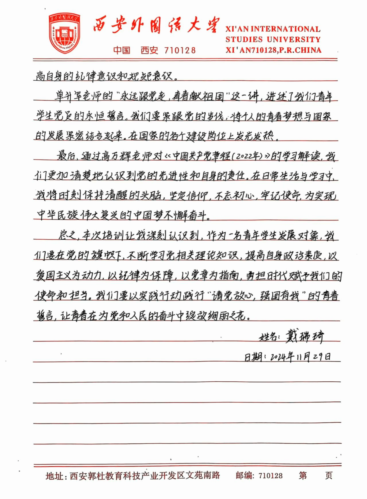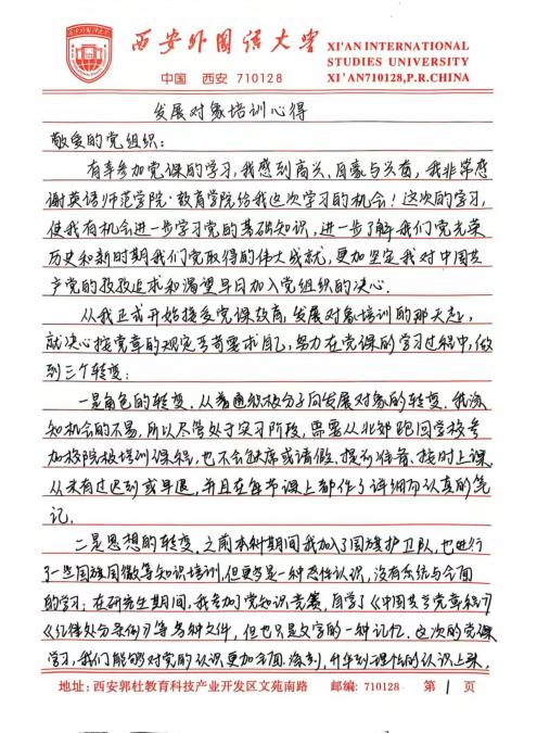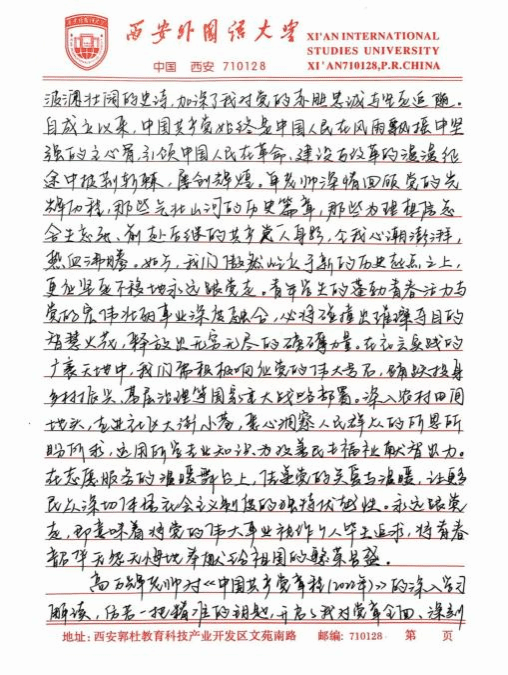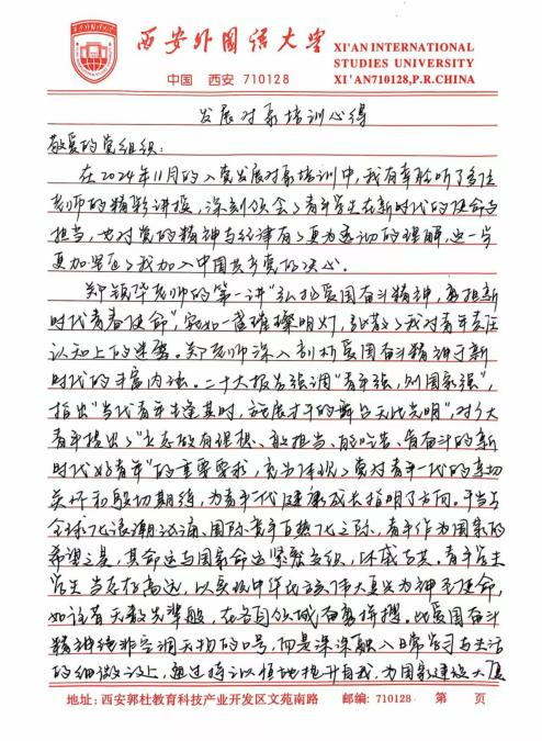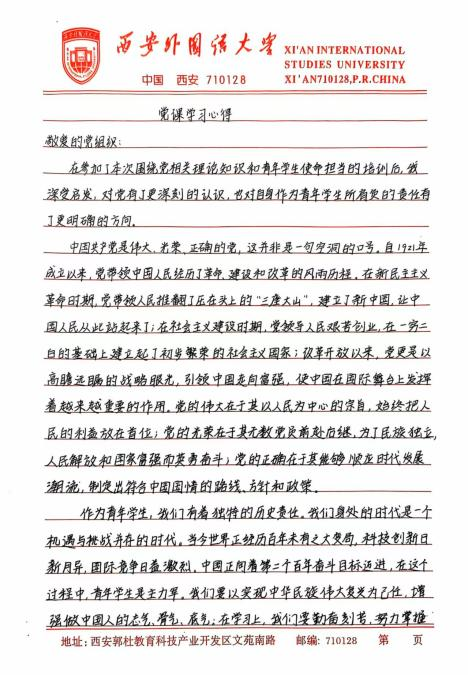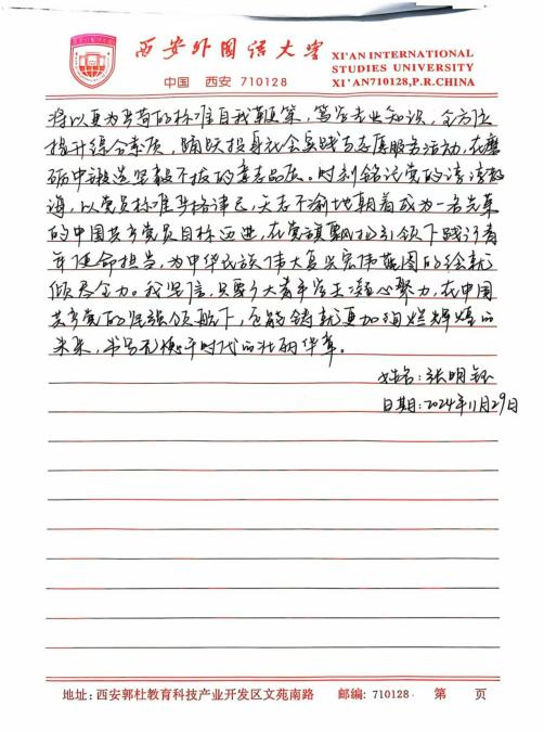 此次培训让我深刻体悟到,青年学生在新时代的使命与担当是复多元且厚重的,既需要秉持爱国奋斗的崇高精神追求,又要严与律红线底线;既需要坚定不移地永远跟党走,又要深入细致地学习党章党规,便其内化于心,外化于行。在今后的学习、生活与工作让中,我将以更为严格的标准自我鞭策,笃学专业知识,全方位提升综合素质,踊跃投身社会实践与志愿服务活动,在磨砺中锻造坚毅不拔的意志品质。时刻铭记党的谆谆教诲,以党员标准严格律已,矢志不渝地朝着成为一名光荣的中国共产党员目标西进,在党旗飘洋引领下践行青年便命担当,为中华民族伟大复兴宏伟燕图的绘就倾尽全力。我坚信,只要广大青年学生凝心聚力,在中国共产党的坚强领航下,它能铸就更加了绚烂辉煌的未来,书写无愧雨时代的壮丽华章。