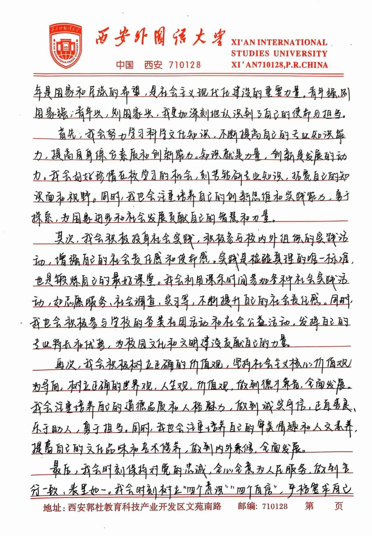 作为青年学生,我们有着独特的历史责任。我们身处的时代是一个机遇与挑战并存的时代。当今世界正经历百年未有之大变局,科技创新日新月异,国际竞争日益激烈。中国正向着第二个百年奋斗目标迈进,在这个过程中,青年学生是主力军。我们要以实现中华民族伟大复兴为己任,增强做中国人的志气、骨气、底气:在学习上,我们要勤奋刻苦,努力掌握科学文化知识,提高自身的综合素质,为将来投身国家建设打下坚实的基础。在社会实践中,我们要积极参与志愿服务,科技创新等活动,为解决社会问题、推动社会进步贡献自己的力量。例如,青年学生可以积极参加创新创业大赛,帮助农村发展特色产业、提升教育水平,改善生态环境等,助力乡村振兴。