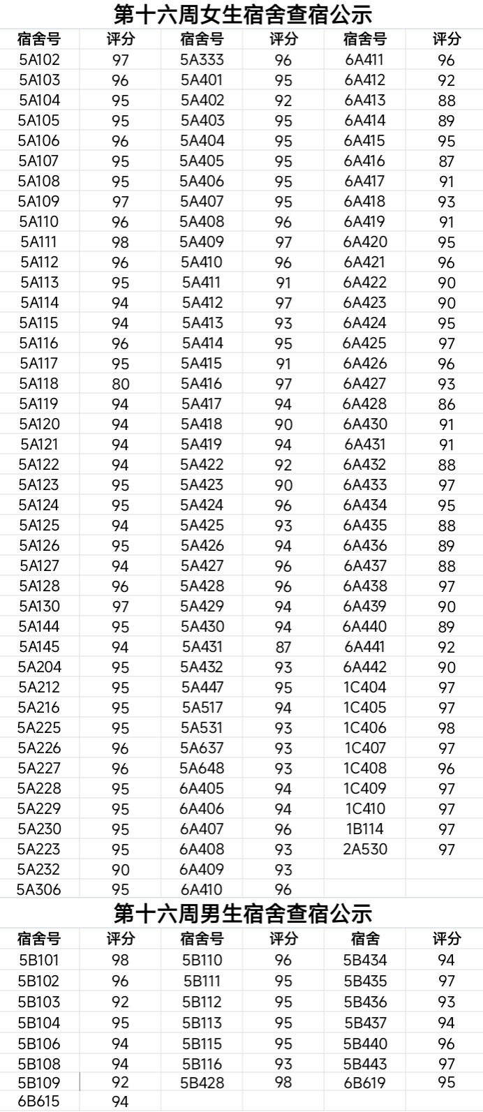 按例开展了第十六周宿舍卫生检查活动。在本次宿舍卫生安全检查中,大部分宿舍卫生情况良好,桌面摆放整齐,地面干净整洁,未发现违规使用电器的情况。然而,美中不足的是,少数宿舍在杂物摆放、桌面整洁度方面还有提升空间。希望同学们能够自我改善,共同营造一个更加洁净卫生的宿舍环境,争取下次检查能有一个更好的表现。