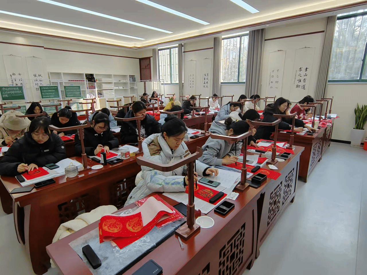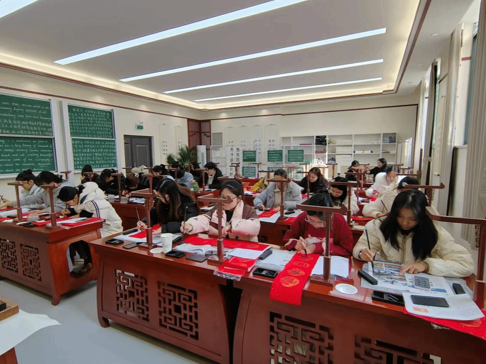 当同学们铺展红宣纸,蘸饱墨汁,挥毫落纸的瞬间,整个世界仿佛都安静了下来。一笔一划,一撇一捺,皆是专注与用心的倾注。从构思春联的内容,到精心雕琢每一个字的形态,这个过程如同一场心灵瑜伽,将平日里的浮躁与焦虑悄然驱散。书法本就是一种极具治愈性的艺术形式,它要求书写者心无旁骛,沉浸在笔画的起承转合中,忘却外界的纷扰与压力。每一次运笔,都是一次与内心的深度对话,在横竖撇捺间,同学们找到了内心的宁静港湾,让被快节奏生活扰乱的心灵得到了片刻的休憩与舒缓。