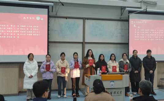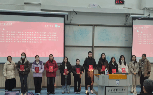 会议第二项,颁发优秀实习生证书。各实习学校的带队教师逐一上台,为在实习期内表现出色、成绩斐然的优秀实习生颁发荣誉证书。这一环节不仅是对实习生们辛勤努力的认可,更是对他们在实践中展现出的专业素养、团队合作精神以及创新能力的高度赞扬。