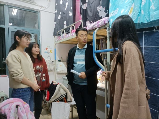 在走访宿舍过程中,辅导员丁威认真听取同学们的意见建议,鼓励同学们尽快调整个人状态,全身心投入新学期的学习生活,严格遵守学校课堂纪律,保持积极乐观的生活态度。同时,丁老师关注同学们的学习与思想状况,询问新学期伊始有无疑惑,表示有任何困难都可以向老师寻求帮助。在走访毕业生宿舍时,丁老师还不断鼓励忙于论文与工作的同学,积极拓宽就业渠道,用幽默的语言缓解毕业生的压力。