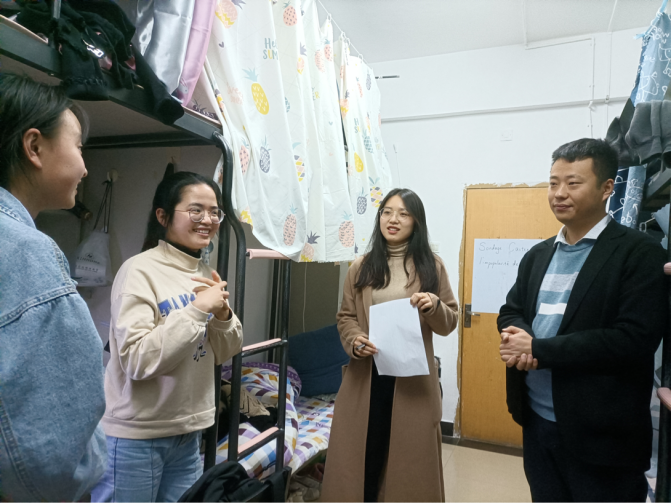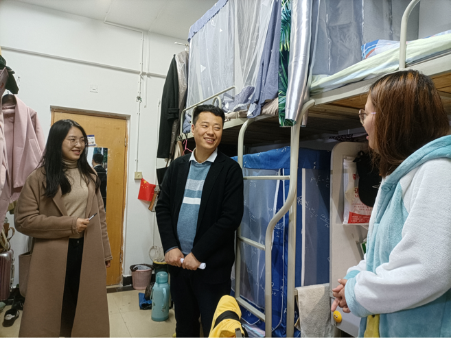 研究生辅导员薛璐和丁威走访了研究生三个年级宿舍,与同学们亲切交流,答疑解问,送上学院老师的关怀。