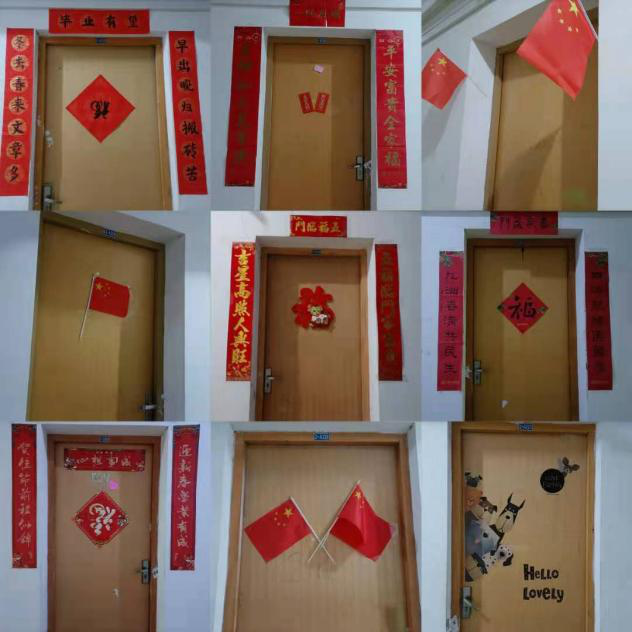 在次期间,两位辅导员老师还被同学们宿舍门口的装饰所吸引,有可爱的卡通图案、喜庆的对联还有庄严的国旗,凡此种种皆表现出同学们对生活的热爱。