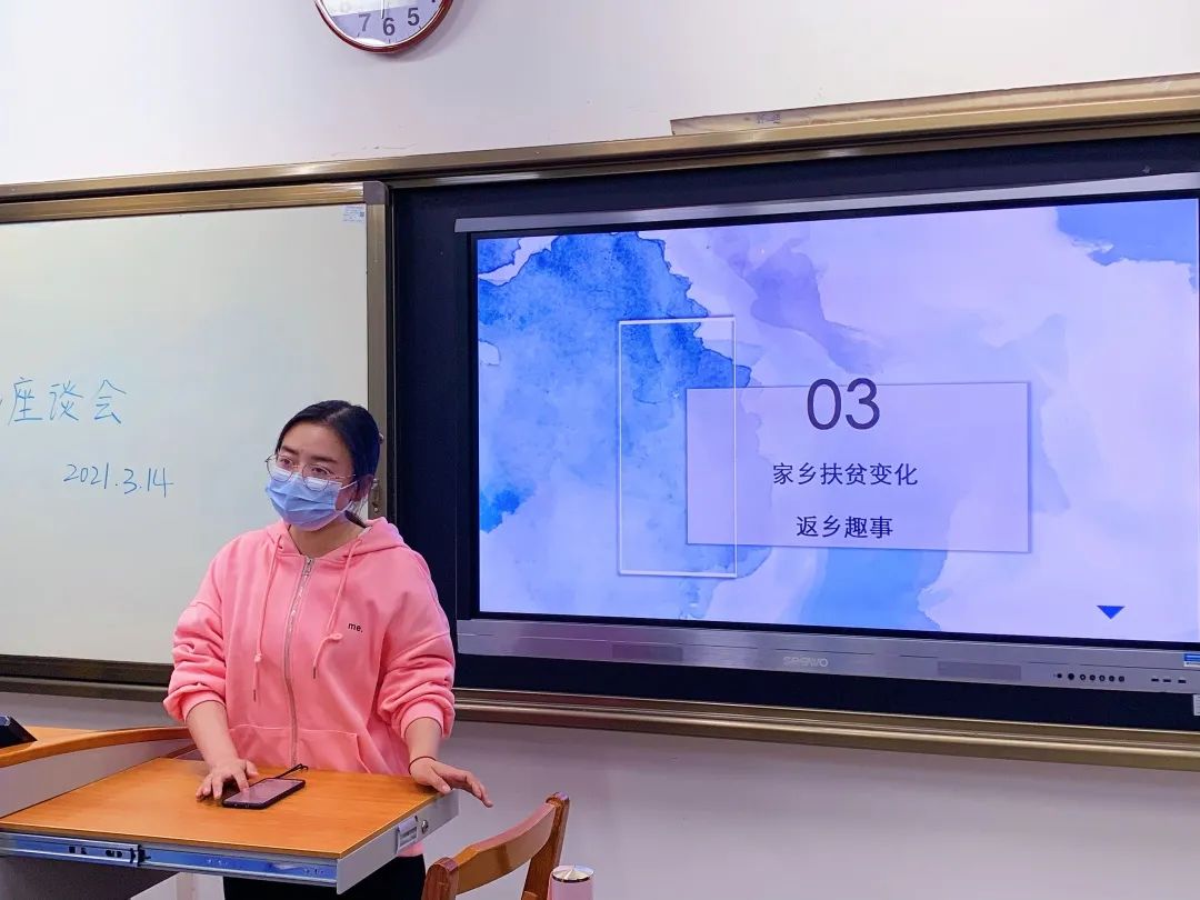 不少同学见证了自己的家乡建设的越来越好,在座谈会上分享了家乡在脱贫攻坚下的巨大变化和切身体会。分享故事的她们告诉大家:脱贫是真真切切看到的,感受到的,我们的祖国在动员全党全社会的力量,改善民众生活条件。我们更加清晰地见识了现实中的脱贫过程,也深切的体会到了翻天覆地的脱贫成果和艰辛奋斗的脱贫历程。就像杜亦菲同学在分享中感悟到的一样:只有把自己变得更好,才配得上如今盛世!