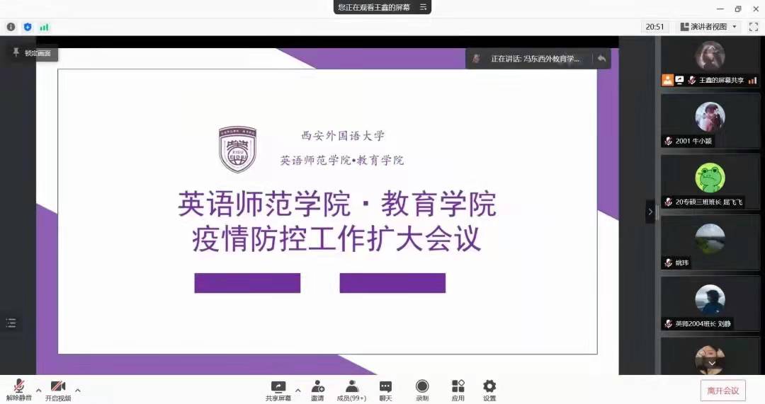 在线上召开疫情防控工作扩大会议。党委书记姚玮、院长孙二军、副院长冯东、副院长王嘉铭、全体辅导员老师以及学生骨干参加本次会议。党委副书记刘一静主持。