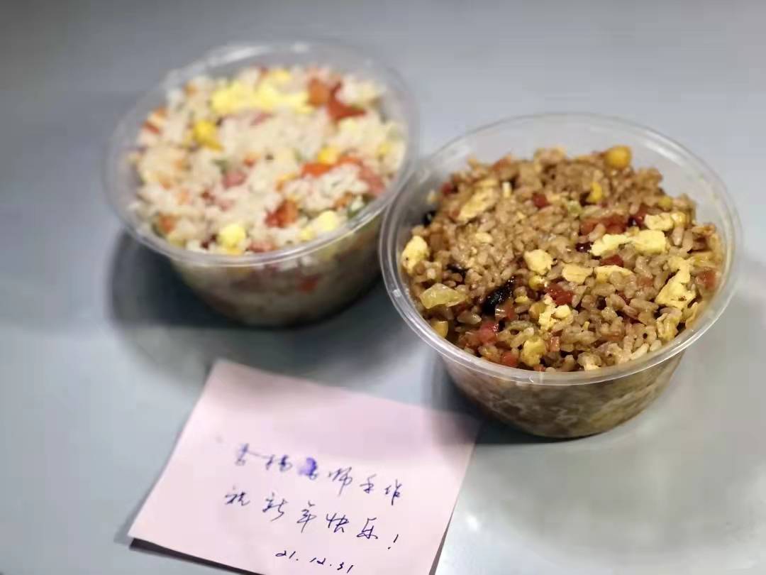 老师在群里发布照片后,经过一番激烈的竞猜,同学们做好防护飞速下楼,与老师合影留念回到宿舍后纷纷晒出图片,原来是学院老师们亲手制作的爱心炒饭!“小小的一碗炒饭吃出了妈妈的味道”有同学如是说道。