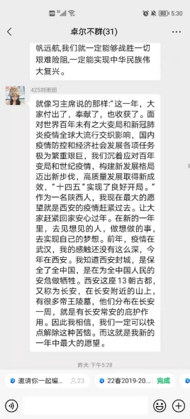 “回首这一年,意义非凡。我们亲历了党和国家历史上具有里程碑意义的大事。”新年前夕,习近平总书记发表二〇二二年新年贺词,回顾难忘的“中国声音、中国瞬间、中国故事”,点赞“无数平凡英雄拼搏奋斗,汇聚成新时代中国昂扬奋进的洪流”。习近平总书记铿锵的话语、豪迈的宣示、殷切的关怀、深情的祝福,点燃亿万人民“一起向未来”的奋斗激情。百年征程波澜壮阔,百年初心历久弥新。我们国家能如此成功地发展到现在,离不开党的正确领导和包含马克思列宁主义、毛泽东思想、邓小平理论、“三个代表”重要思想、科学发展观、习近平新时代中国特色社会主义思想在内的指导思想。疫情之后,我们国家一步步走过来,不断总结经验,提高应对各种疫情带来的突发状况的能力水平。唯物史观也是我们认识把握历史的根本方法。
