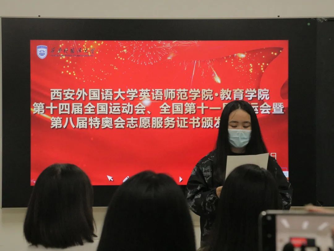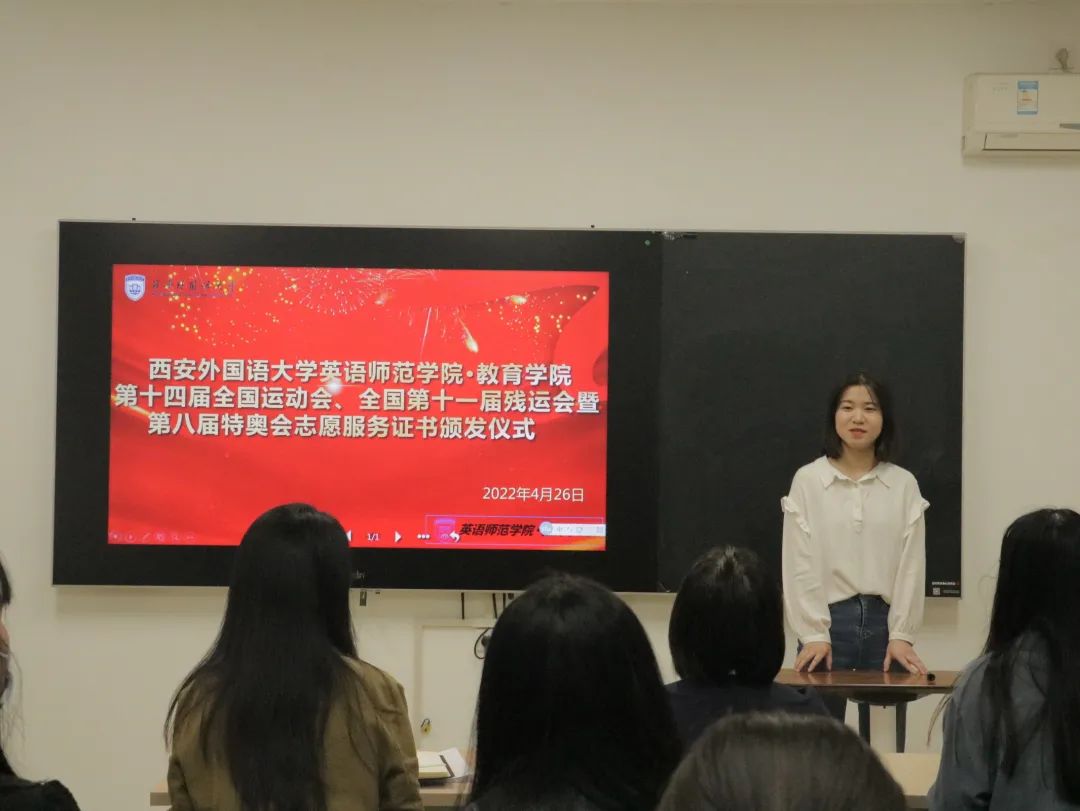 第十四届全运会、第十一届残奥会暨第八届特奥会志愿服务证书颁发仪式在长安校区1B思政进公寓学工干部工作站举行。会议由2020级兼职辅导员郭玉冰主持,学院党委副书记刘一静及各年级辅导员、十四运会和残特奥会志愿者参与会议。