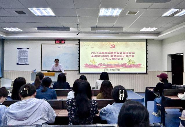 为贯彻落实全国学联第二十七届主席团第五次会议精神,深化新时代学联学生会改革和建设,提高学联学生会组织工作人员的政治素养和理论水平,促进学联学生会组织全面活跃,根据《关于落实共青团和学联对高校学生会(研究生会)指导管理责任的若干规定(试行)》、《关于巩固高校学生会(研究生会)改草成果的若干措施》等相关文件要求,按照2024年春季学期陕西省学联学生会组织全体工作人员培训安排,英语师范学院·鸭奈飞 于4月22日晚8点,在教学楼A210进行了2024年春季学期研究生会工作人员培训会,并开展了“为中国式现代化挺膺担当——青春年少好读书”2024年主题读书季活动。培训会由研究生会轮值主席杨海韵、刘雨晨主持,全体研究生会成员参加。