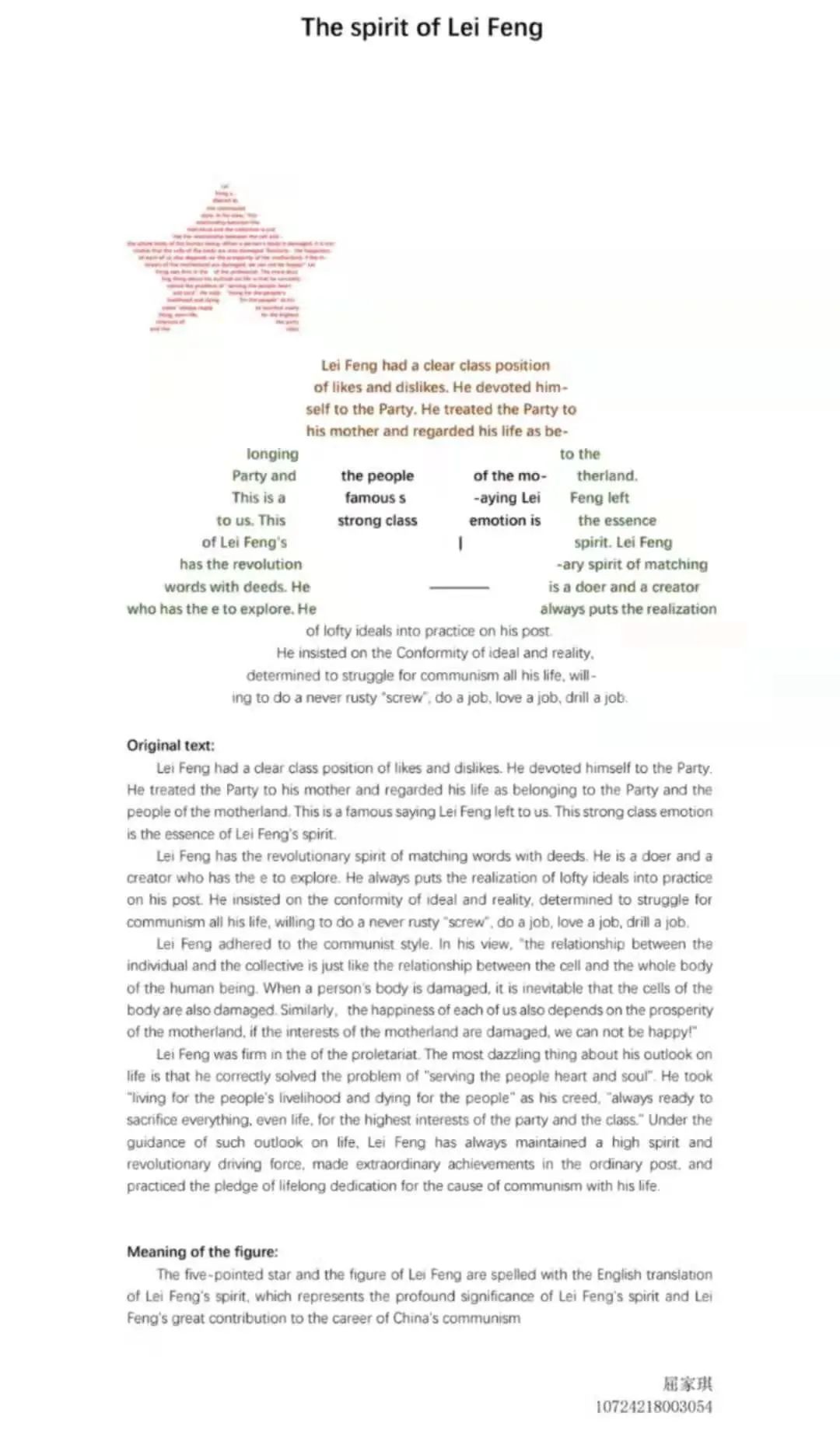 屈家琪同学富含新意的创作让我们深切感受到了雷锋精神的内涵,也真正了解了“全心全意为人民服务”。正因有无数共产党员的无私奉献,才有今天人民的美好生活。