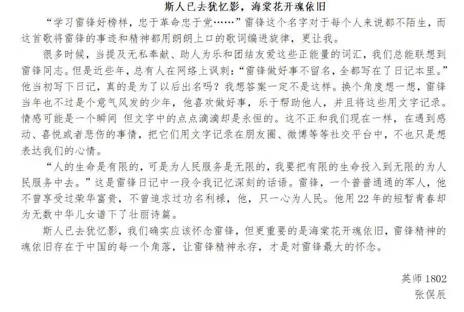 一句“斯人已去犹忆影,海棠花开魂依旧”道尽了张俣辰对雷锋同志的追忆和雷锋精神的永垂不朽。斯人虽已逝,但他伟大的精神却被世世代代地传颂与学习着。