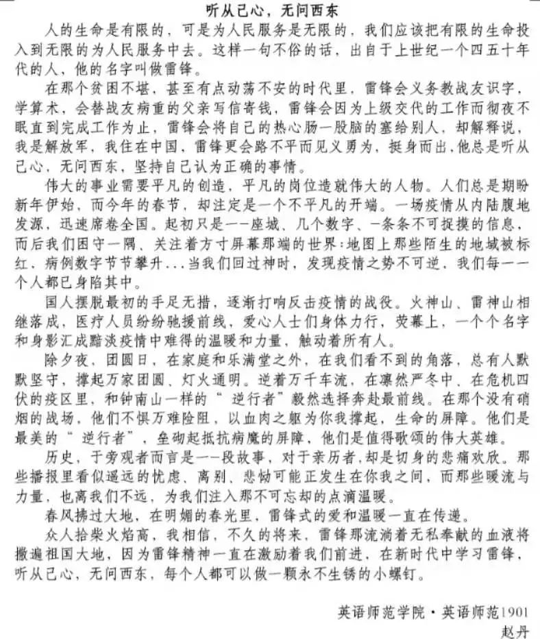 如赵丹同学所言:听从己心,无问西东。庚子年初,新冠病毒横扫神州大地,因雷锋精神的文化基因一直根存于中华民族,所以我们团结一心,倾力奋战,最终春暖花开,病霾消散。