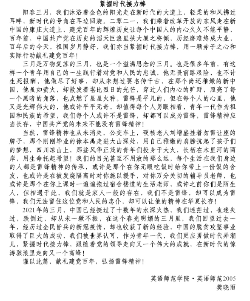三月的星光照亮长夜的路,三月的彩霞点燃心中的火。一代又一代新青年在紧握时代接力棒前行的同时,从未忘记亲身践行雷锋精神,正如樊晓雨同学所写。