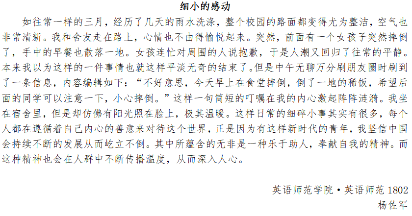正如杨佐军同学所写的“细小的感动”,雷锋精神不是遥不可及,恰恰相反,它存在于许许多多细微之处。他所描述的事例简单而又真实,无时无刻不在发生着。这告诉我们,雷锋精神应是习惯、是涵养、是融入精神深处的本能与自我选择。
