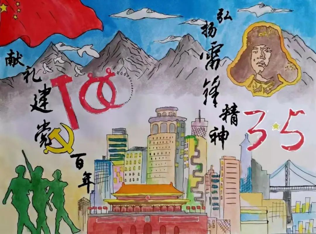 英教1803班的王怡涵同学创作了题为《弘扬雷锋精神,献礼建党百年》的优秀画作,积极践行社会主义核心价值观,激励人民向雷锋同志学习。