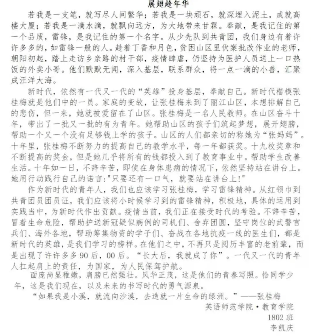 李凯庆同学在张桂梅老师身上看见了当代雷锋精神最好的体现。“无私”“奉献”,这两个词多么平凡,却又那样有力、那般让人动容。