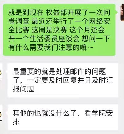 权益部第十五届负责人与上一届负责人采用线上交流方式,对本学期以来的工作进行了总结。新一届负责人就其中存在的问题向上一届负责人请教解决方案。