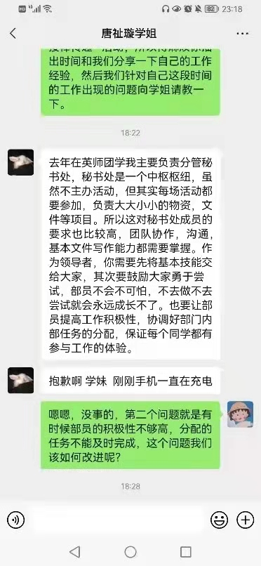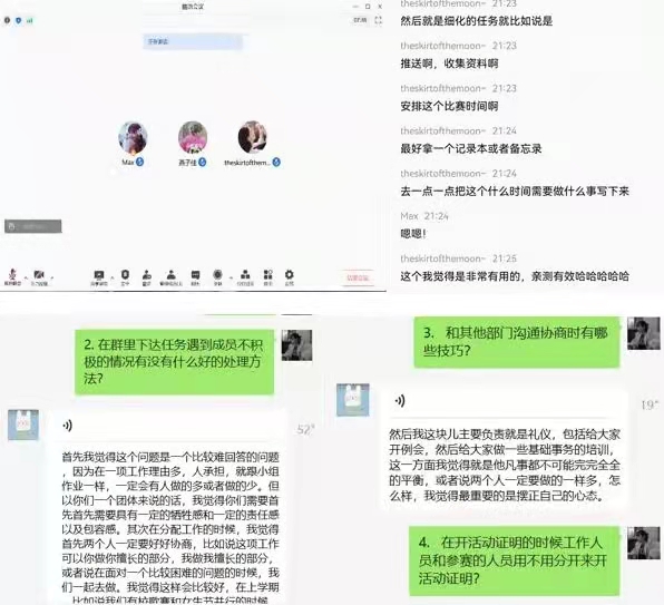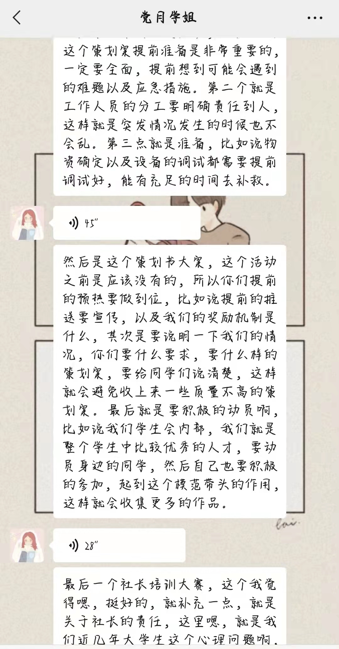 非常感谢两位姐姐给我们答疑解惑。我们正式成为文艺部负责人已经三个月了,相关的工作我们基本上已经掌握的差不多了。在此期间确实遇到很多问题需要咨询两位姐姐。非常开心能有这次活动让我们可以集中解决这些细小的问题。姐姐们也非常耐心回答我们的问题,条理清晰,告诉我们事无巨细,都需要我们自我调节,学会沟通。同时,也提醒我们办完每一场活动除了留好活动证明还要给自己留底子,方便之后的复盘等等。有一些姐姐提醒的点我们之前可能并没有意识到,这也告诉我开展活动的时候需要考虑到方方面面,统筹协调,把任务细化,及时记录下来,才能有条理展开各项工作。经过这次活动,我们也有更信心在接下来的工作生活里发挥各自的长处,办好每一场活动,不负团学的期望!