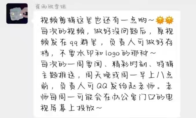 新媒体中心新一届负责人与上一届负责人采用腾讯会议+微信的形式进行了工作交接,通过腾讯会议说明本次交流的主题及涵盖的要点。上一届负责人在微信群对各自部门的工作作出了安排。