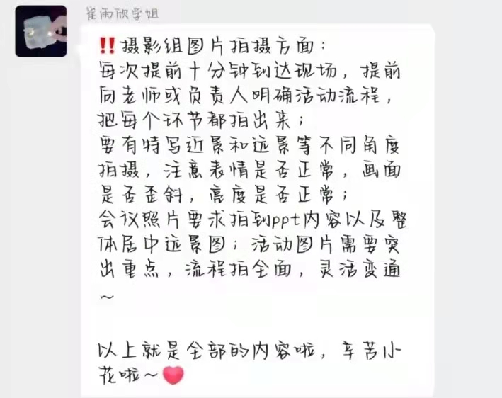 在会议中学姐们传授时及时做好记录,会后及时总结反思得出收获。通过此次活动,两位负责人在工作统筹处理上也有了更多的经验,今后也将会把学姐们传授的方法付诸于工作实践中,更加用心的对待工作,为团学发展出一份力!