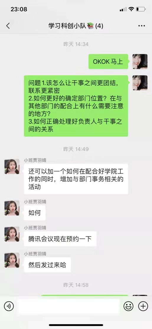 为响应换届工作“交接棒传递”活动,提高工作效率,学习科创部采用线上线下相结合的方式与上届负责人以及分管主席进行了详细的工作交接。上一届负责人与分管主席就工作例会、早晚自习、“三笔一话”大赛、模拟授课大赛等多项活动进行了说明,并对新一届负责人提出的问题予以了解答。