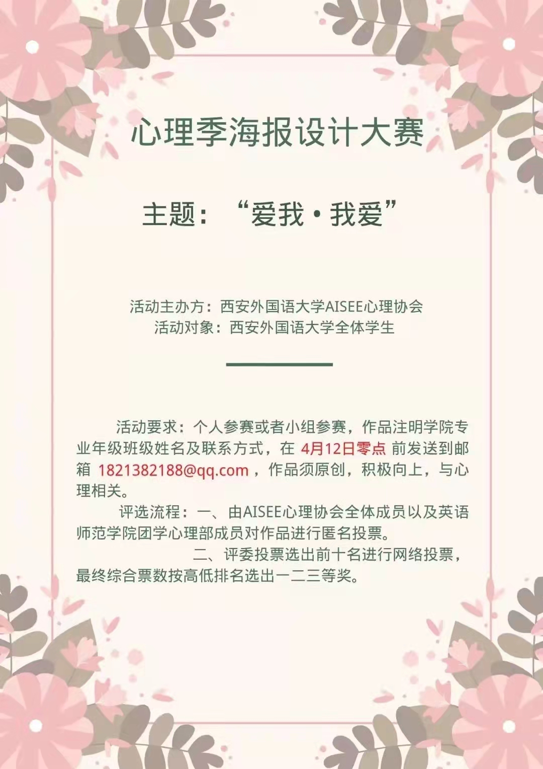 阳春三月,春暖花开,一年一度的3.25-5.25心理季活动如期而至。为改善西外学子的心理健康,AISEE心理协会特策划心理季海报设计大赛。本次比赛以“爱我·我爱”为主题,同学们从生活中取材(与心理相关)进行海报创作。作品内容要求积极向上、传递温暖、力求创新,最终参赛的海报会以评委投票(40%)+线上投票(60%)的综合成绩评选出一、二、三等奖。