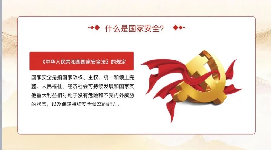 2023年4月15日,是第8个全民国家安全教育日。深入学习贯彻总体国家安全观、增强忧患意识,是我们每一个公民的责任。为深入开展国家安全教育活动,进一步提升总体国家安全观,扎实深入开展学校安全教育和党史学习教育,增强学生的国家安全意识,我班决定组织开展此次“国家安全·与你我同行”的主题团日活动。