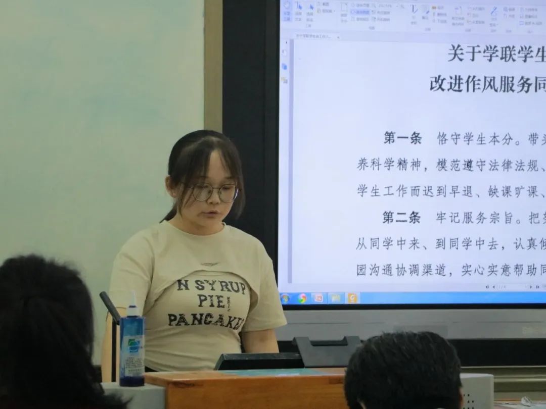 最后在作风建设方面,李俊霞带领学习《关于学联学生会工作人员改进作风服务同学的若干规定》,要求学联学生会工作人员要胸怀崇高理想,恪守学生本分,牢记服务宗旨,以更高的标准要求自己,守纪律、讲原则、做表率,塑造清新阳光的组织形象。