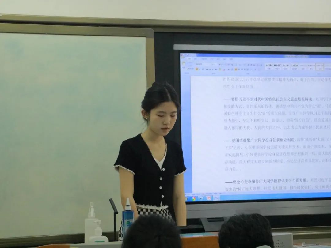 接着,杜亦菲从规章制度板块带领学习《共青团指导学生联合会工作的若干规定(试行)》,对学生联合会工作规章制度做了详细说明。青年学生骨干要牢记服务宗旨,充分发挥工作骨干的示范带头作用,牢固树立全心全意为同学服务意识。