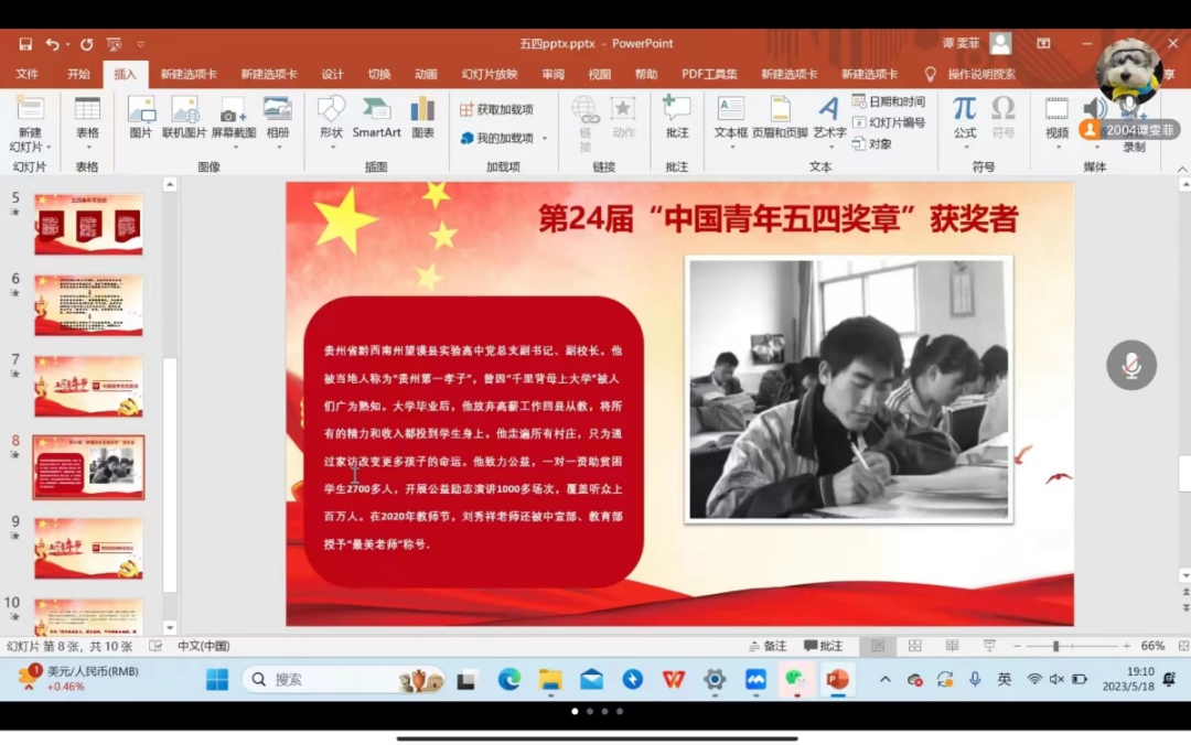 (二)其次,谭雯菲向同学们介绍了何为中国青年五四奖章,并向同学们娓娓道来第24届“中国青年五四奖章”获得者刘秀祥的先进事迹故事。