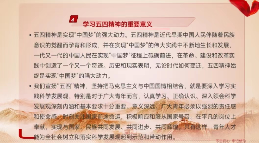 (5)最后,大家一起了解了学习五四精神的重要意义,激励大家以强烈的责任感和使命感,时刻关注国家前途命运,积极响应和服从国家号召,为全社会树立和落实科学发展观起到示范和带动作用。