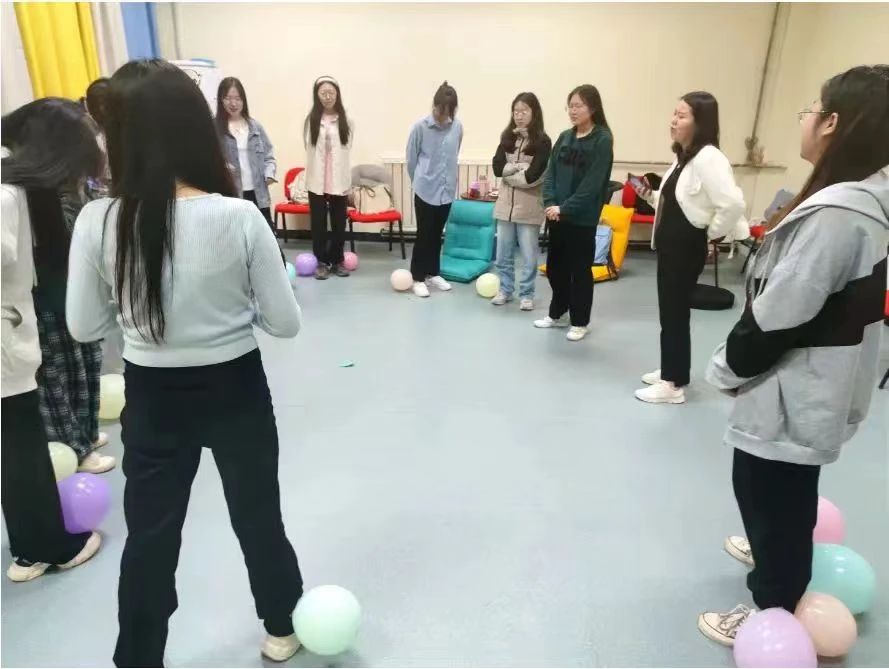 接着是“压力爆破”——释放压力,宣泄情绪。在杨老师的带领下,心理委员们分别把自己目前的压力和烦恼吹入气球中并系在脚踝处,相互协助踩爆,释放彼此的压力。