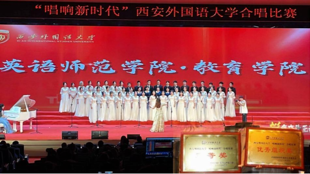 师生合唱成员盛装出席,身着长裙礼服和西装,伴随着婉转柔长的钢琴声,凭借《不忘初心》和《有我》两首歌曲在比赛中荣获三等奖及优秀组织奖的好成绩,展现出了鸭奈飞