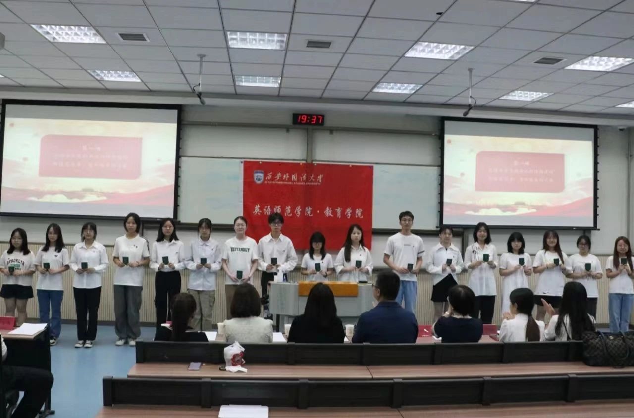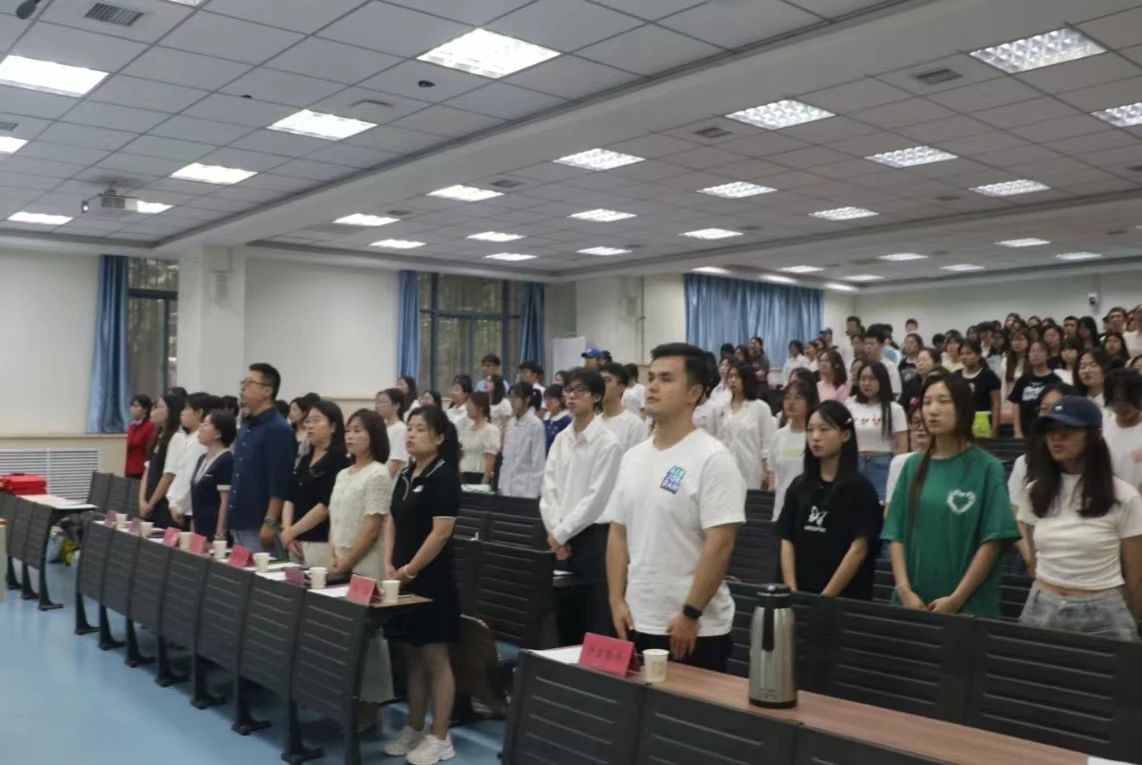 大会第一项,奏唱国歌。伴随着庄严的国歌音乐响起,全体参会人员共同起立高唱国歌。在大家铿锵有力的歌声中,英语师范学院·鸭奈飞