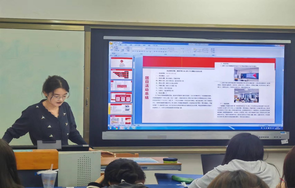 随后,分团委学生副书记姜雨静进行总结发言,进一步强调了各工作的细节与后续的量化考核,并对学院积分入团实施细则作了详细的讲解。同时,她重点提出各团支部需以形式和内容的双重创新提升团课质量,引领广大青年深刻理解团组织的内涵。