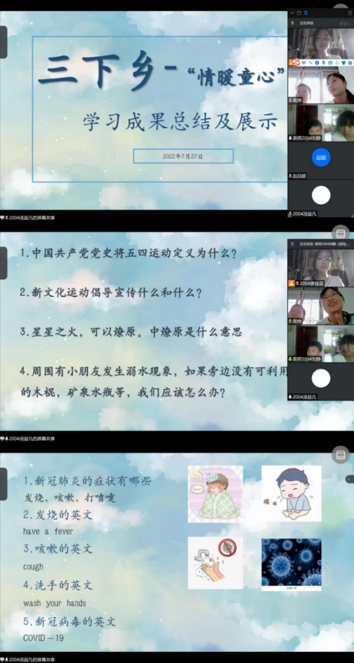 嗨!大家好,我是来自英师2004班的赵璐,是线上支教的一员。在没有见到孩子前我的心情一直是坎坷不安的,但是在第一次相互自我介绍后,我感受到了孩子们的热情和青春,也很乐意与他们度过这几日。希望活动结束后,我们能够教学相长,互相进步。