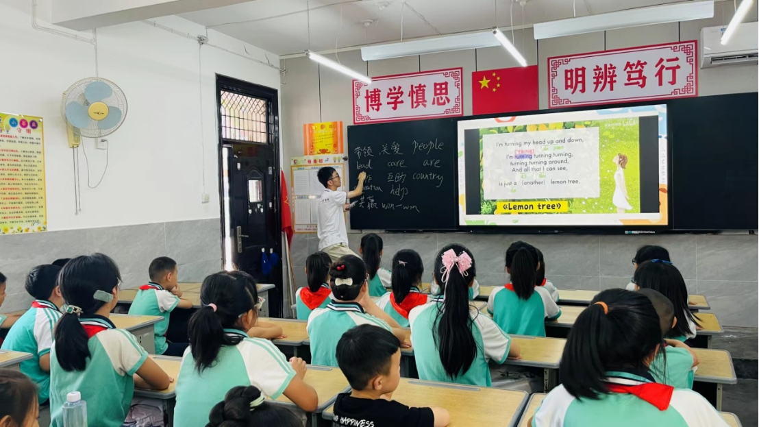 城关三小的支教队伍负责五升六年级五个班级的英语课程,包括预习课、复习课和兴趣课。支教老师们主要以活动课程的方式增加课堂的趣味性,带领学生们在互动交流中感受英语课堂的魅力。课堂上,志愿者们通过游戏、英文歌曲等多种方式带动学生们积极参与课堂,使学生们不仅能够充分掌握所学知识而且能进行简单的日常交流,提升学生的口语表达能力。