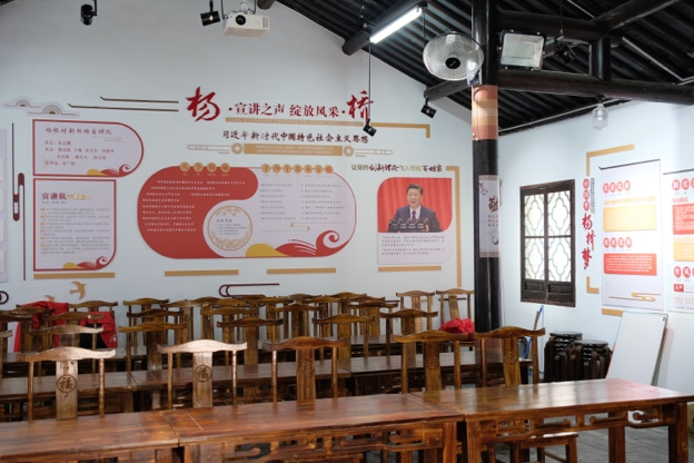 第一站,调研队在村领导及工作人员的指引下前往杨桥村党群服务中心。杨桥村党委副书记徐立平为大家详尽地介绍了杨桥村的地理规划、历史渊源、得名由来、文化民俗、乡贤名人等。