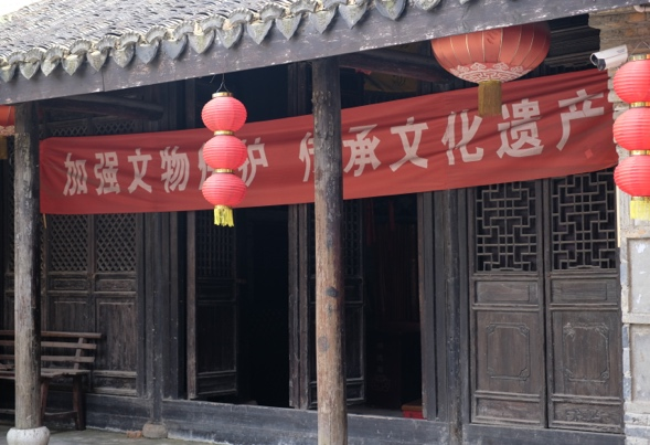 在杨桥村团书记顾杰的带领下,调研队伍来到太平庵前。庵堂始建于明代重修建于现代,外观大气而不失肃穆,颜色明黄而锃亮。经介绍,太平庵为杨桥古寺,是当地居民举行祭祀、祭拜祖先之地,也是村子里保存完善的古建筑之一。在青石街上缓步向前,便来到了街中心一座古雅的建筑前,牌匾上提“南杨宴”三大字。据顾杰介绍,队员们了解到“南杨宴”早年为杨桥内的一座戏楼,现在被重新开发,用作私人宴请的处所。