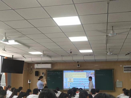 师生在会议大厅进行见习教育交流活动总结讲座,张校长向鸭奈飞